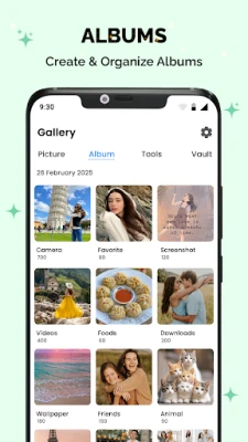 உங்கள் தனிப்பட்ட தருணங்களுக்குப் பாதுகாப்பு வழங்குவது "Gallery - Album & Photo Vault" இன் முதன்மையான அம்சமாகும். ரகசியமான புகைப்படங்கள் மற்றும் காணொளிகளைப் பாதுகாப்பான PIN பாதுகாப்புடன் மறைக்கப்பட்ட கோப்பகத்தில் சேமிக்கலாம். இது அங்கீகரிக்கப்படாத அணுகலைத் தடுப்பதுடன், உங்கள் முக்கியமான நினைவுகள் எப்போதும் பாதுகாப்பாக இருப்பதை உறுதிசெய்கிறது. மேலும், உங்கள் புகைப்படங்களை எளிதாக ஒழுங்கமைக்கலாம் – தேதி வாரியாக, கோப்புறை வாரியாக அல்லது நீங்கள் உருவாக்கும் விருப்பமான ஆல்பங்கள் மூலமாகப் பிரிக்கலாம். இது ஒரு முழுமையான கோப்பு மேலாளர் போலச் செயல்பட்டு, உங்கள் பெரிய மீடியா சேகரிப்பை எளிதாகவும், மென்மையாகவும் உலாவ உதவுகிறது.