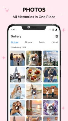 கற்பனைத்திறன் மற்றும் பயன்பாட்டுக்கான கருவிகளுடன், "Gallery - Album & Photo Vault" உங்கள் புகைப்படங்களை அடுத்த கட்டத்திற்குக் கொண்டு செல்கிறது. அற்புதமான படத்தொகுப்புகளை உருவாக்கலாம், படங்களை மேம்படுத்தும் எடிட்டிங் கருவிகளைப் பயன்படுத்தலாம், அல்லது உங்களுக்குப் பிடித்த மேற்கோள்களைப் படங்களுடன் இணைத்து அழகான காட்சிகளை உருவாக்கலாம். தேவையற்ற நகல் படங்களைக் கண்டறிந்து நீக்குவதன் மூலம் உங்கள் சேமிப்பக இடத்தை மேம்படுத்தலாம். மேலும், ஸ்லைடு காட்சிகள் மற்றும் கதைக்காட்சிகளுக்காகப் புகைப்படங்களை காணொளிகளாக மாற்றும் தனித்துவமான திறனும் இதில் உள்ளது. உங்களின் ஒவ்வொரு தேவையையும் பூர்த்தி செய்யும் ஒரு மேம்பட்ட புகைப்பட மேலாண்மைச் செயலியாக "Gallery - Album & Photo Vault" திகழ்கிறது.