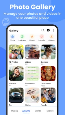 உங்கள் புகைப்படங்களுக்கு புத்துயிர் ஊட்ட, "Gallery - Photo Album, Vault" ஒரு சக்திவாய்ந்த எடிட்டரை வழங்குகிறது. ஃபில்டர்களைப் பயன்படுத்துதல், கிராப் செய்தல், சுழற்றுதல் மற்றும் அடிப்படை நிறங்களைச் சரிசெய்தல் போன்ற அம்சங்களுடன் உங்கள் படங்களை மேம்படுத்தலாம். AI-உதவியுடன் கூடிய கருவிகள் மூலம் மேலும் ஆக்கப்பூர்வமான எடிட்களைச் செய்யலாம் மற்றும் உங்கள் செல்ஃபிக்களை மெருகூட்டலாம். அத்துடன், கதைகள் உருவாக்கும் (Story Maker) அம்சம் மூலம் உங்கள் படங்களை மினி ஸ்லைடுஷோக்களாக மாற்றலாம். டிஜிட்டல் குப்பைகளை அகற்றும் டூப்ளிகேட் கிளீனர், ஒரே மாதிரியான புகைப்படங்களைக் கண்டறிந்து நீக்கி, உங்கள் சேமிப்பக இடத்தை விரைவாக விடுவிக்க உதவும். தேதி, அளவு அல்லது பெயர் வாரியாகப் புகைப்படங்களையும் வீடியோக்களையும் வரிசைப்படுத்துதல், நகர்த்துதல், நகலெடுத்தல் அல்லது நீக்குதல் போன்ற முழுமையான மேலாண்மை அம்சங்களும் இதில் உள்ளன. JPEG, PNG, GIF, RAW, MP4 போன்ற அனைத்து பிரபலமான வடிவங்களையும் ஆதரித்து, உங்கள் மீடியா கோப்புகள் அனைத்தும் ஒரே இடத்தில் கிடைக்கும்.