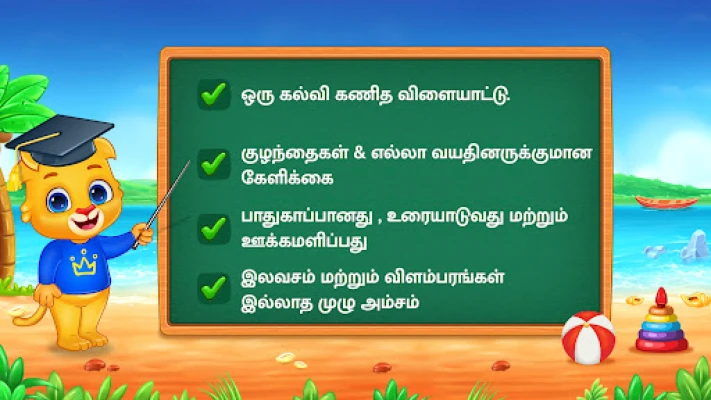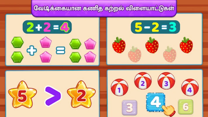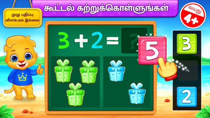 விளையாட்டின் மூலம் கற்கும் போது, குழந்தைகள் தகவல்களை எளிதில் மனதில் பதிய வைத்துக்கொள்வார்கள். இது அவர்களின் கற்றல் ஆர்வத்தை தூண்டி, மழலையர் பள்ளி மற்றும் அதற்குப் பிந்தைய கல்வியில் சிறந்த அடித்தளத்தை அமைக்கிறது. பெற்றோர்கள் தங்கள் குழந்தைகளின் முன்னேற்றத்தை எளிதாகக் கண்காணிக்கவும், விளையாட்டின் சிரம நிலையை சரிசெய்யவும், அல்லது செயல்திறனைக் காண அறிக்கை அட்டைகளைப் பார்க்கவும் மேத் கிட்ஸ் விளையாட்டு உதவுகிறது. எந்தவிதமான தொந்தரவோ அல்லது மறைமுக கட்டணங்களோ இல்லாமல், குழந்தைகளுக்காகவே முழுமையாக வடிவமைக்கப்பட்ட ஒரு பாதுகாப்பான கற்றல் சூழலை இது வழங்குகிறது. எண்ணுதல், கூட்டல் மற்றும் கழித்தல் அடிப்படைகளுக்கான சரியான அறிமுகமாக திகழ்ந்து, தர்க்கரீதியான சிந்தனையையும் வாழ்நாள் முழுவதும் கற்கும் ஆர்வத்தையும் வளர்க்கிறது.