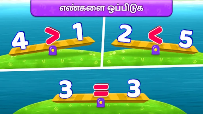 மேத் கிட்ஸ் விளையாட்டு, குழந்தைகளுக்கு கணக்கியலை ஒரு சாகசப் பயணமாக மாற்றும் பலவிதமான புதிர்களையும் மினி-கேம்களையும் கொண்டுள்ளது. பொருட்களை எண்ணக் கற்றுக்கொள்வது, பெரிய மற்றும் சிறிய எண்களை ஒப்பிடுவது, அல்லது திரையில் எண்களை இழுத்து கூட்டல் கணக்குகளை உருவாக்குவது என ஒவ்வொரு செயல்பாடும் கற்றலை உற்சாகப்படுத்துகிறது. விடுபட்ட எண்களைக் கண்டுபிடித்து கூட்டல் மற்றும் கழித்தல் கணக்குகளைத் தீர்ப்பது, அல்லது தங்கள் கணிதத் திறனை சோதிக்க வினாடி வினாக்களில் பங்கேற்பது போன்ற விளையாட்டுகள் குழந்தைகளின் சிந்தனைத் திறனை மேம்படுத்துகின்றன. இந்தக் கலகலப்பான சவால்கள், அடிப்படை கணிதக் கருத்துகளை வலுப்படுத்த உதவும் வகையில் கவனமாக வடிவமைக்கப்பட்டுள்ளன.