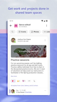 ஒன்றுசேர்ந்து திட்டங்களையும் இலக்குகளையும் நிறைவேற்றுங்கள். முக்கியமான தருணங்களை விரைவாகவும் எளிதாகவும் பகிர, அரட்டைகளில் புகைப்படங்களையும் வீடியோக்களையும் அனுப்பலாம். பயணத்தின் போதும் பகிரப்பட்ட ஆவணங்களையும் கோப்புகளையும் அணுக கிளவுட் சேமிப்பகத்தைப் பயன்படுத்தலாம். சமூகத்தில் நிகழ்வுகள், புகைப்படங்கள், இணைப்புகள் மற்றும் கோப்புகள் போன்ற பகிரப்பட்ட உள்ளடக்கத்தை ஒழுங்கமைத்து நேரத்தைச் சேமிக்கலாம்*. ஸ்கிரீன் ஷேர், ஒயிட்போர்டு மற்றும் பிரேக்அவுட் ரூம்களைப் பயன்படுத்தி உங்கள் சந்திப்புகளை மேலும் பயனுள்ளதாக்குங்கள். தகவலுக்கான அணுகலை நிர்வகிக்கவும், திட்டங்களில் புதியவர்கள் இணையும்போது அல்லது வெளியேறும்போது கூட சரியான நபர்களுக்கு சரியான தகவல்கள் கிடைப்பதை உறுதி செய்யவும். வேலைப் பட்டியல்கள் மூலம் திட்டங்களையும் பணிகளையும் நிர்வகிக்கலாம் - பணிகளை ஒதுக்குதல், காலக்கெடுவை நிர்ணயம் செய்தல் மற்றும் முடித்தவற்றைக் குறித்து அனைவரையும் ஒருசேர ஒருங்கிணைக்கலாம்.