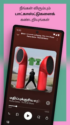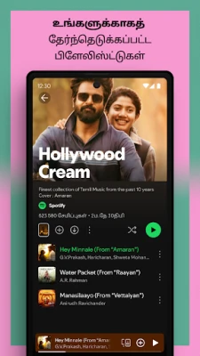 அனிருத், சுஜித்ரா, சின்மயி போன்ற தற்கால கலைஞர்களின் சமீபத்திய படைப்புகளையும், சித்ரா, பிரதீப் குமார், ஜானகி, மனோ போன்ற ஜாம்பவான்களின் காலமற்ற இசையையும் Spotifyயில் அனுபவிக்கலாம். உங்களுக்குப் பிடித்தமான கலைஞர்களின் பாடல்களைத் தினமும் கேட்க, தனிப்பயனாக்கப்பட்ட ரேடியோ பிளேலிஸ்ட்கள் உருவாக்கப்படுகின்றன. விளம்பரத் தொந்தரவு இல்லாத, தடையற்ற இசைப் பயணம் வேண்டுமானால், Spotify Premium சிறந்த வழி. பிரீமியம் மூலம், உங்களுக்கு விருப்பமான பாடல்களையும் பாட்காஸ்ட்களையும் உங்கள் சாதனத்தில் சேமித்து, இணைய இணைப்பு இல்லாமலும் எங்கு வேண்டுமானாலும் கேட்கலாம். தேவைக்கேற்றபடி பாடல்களை இயக்கும் வசதியுடன், தனிநபர், Duo, Family, Student என உங்கள் வசதிக்கேற்ப நான்கு வித சந்தா விருப்பங்கள் உள்ளன. எந்தவித நிபந்தனைகளும் இன்றி, எப்போது வேண்டுமானாலும் சந்தாவை ரத்து செய்யலாம். உங்கள் Wear OS சாதனத்திலும் Spotifyயை பயன்படுத்தி, தொலைபேசி இன்றி இசையையும், ஆடியோபுக்குகளையும் ரசியுங்கள்.